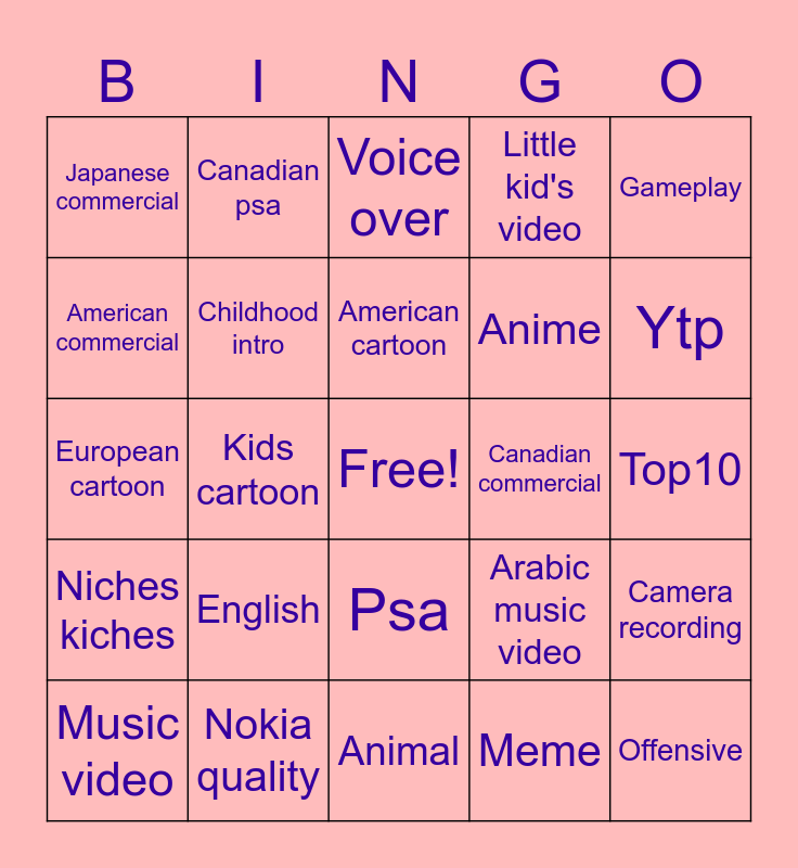 This bingo card has a free space and 24 words: English, Nokia quality, American cartoon, Music video, Gameplay, Japanese commercial, American commercial, Canadian psa, Canadian commercial, Psa, Anime, European cartoon, Arabic music video, Camera recording, Childhood intro, Meme, Top10, Voice over, Ytp, Kids cartoon, Offensive, Niches kiches, Little kid's video and Animal.