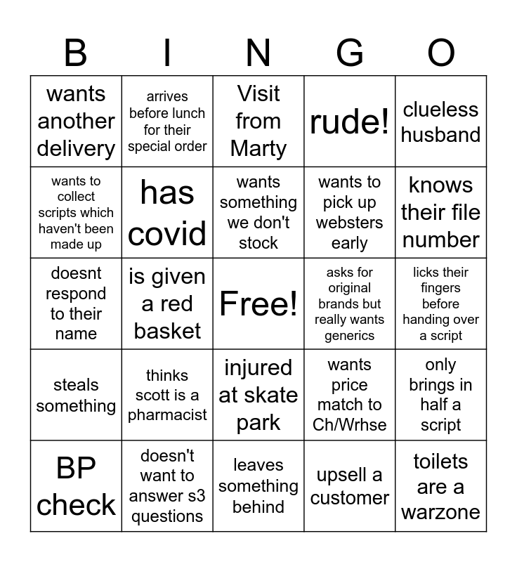 This bingo card has a free space and 35 words: "i'll have the genetic brand", is hard of hearing, mispronounces drug name, rude!, only brings in half a script, doesnt respond to their name, has covid, says they will wait but leaves, wants to pick up websters early, on the phone while being served, steals something, arrives before lunch for their special order, coughs and doesn't cover their mouth, calls someone the wrong name, wants another delivery, thinks scott is a pharmacist, leaves something behind, asks for original brands but really wants generics, licks their fingers before handing over a script, BP check, doesn't want to answer s3 questions, Visit from Marty, upsell a customer, toilets are a warzone, wants to collect scripts which haven't been made up, is given a red basket, injured at skate park, Dr has written script wrong, knows their file number, wants to return an item they've had for more then 2 wks, has a rash, wants something we don't stock, wants price match to Ch/Wrhse, clueless husband and wants Rikodine.