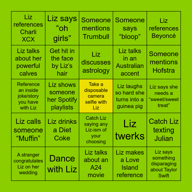 This bingo card has a free space and 24 words: Liz drinks a Diet Coke, Dance with Liz, Liz discusses astrology, A stranger congratulates Liz on her wedding, Liz references Beyoncé, Liz references Charli XCX, Liz talks about her powerful calves, Liz says “oh girls”, Liz laughs so hard she turns into a guinea pig, Catch Liz saying any Liz-ism of your choosing, Liz talks in an Australian accent, Reference an inside joke/story you have with Liz, Liz twerks, Catch Liz texting Julian, Get hit in the face by Liz’s hair, Liz makes a Love Island reference, Liz says she needs a “sweet/sweet treat”, Someone mentions Trumbull, Someone mentions Hofstra, Liz shows someone her Spotify playlists, Liz says something disparaging about Taylor Swift, Liz calls someone “Muffin”, Someone says “bloop” and Liz talks about an A24 movie.