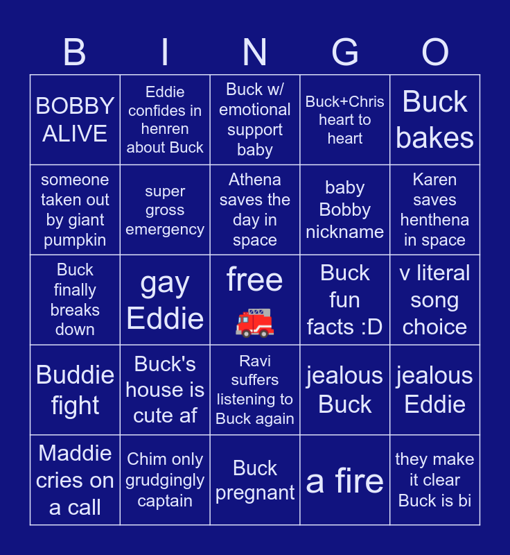 This bingo card has a free space and 24 words: Buck's house is cute af, Chim only grudgingly captain, Athena saves the day in space, Maddie cries on a call, Buck bakes, BOBBY ALIVE, someone taken out by giant pumpkin, Eddie confides in henren about Buck, Buck fun facts :D, Ravi suffers listening to Buck again, baby Bobby nickname, Buck finally breaks down, jealous Buck, jealous Eddie, super gross emergency, a fire, v literal song choice, Buck w/ emotional support baby, Karen saves henthena in space, gay Eddie, they make it clear Buck is bi, Buddie fight, Buck+Chris heart to heart and Buck pregnant.