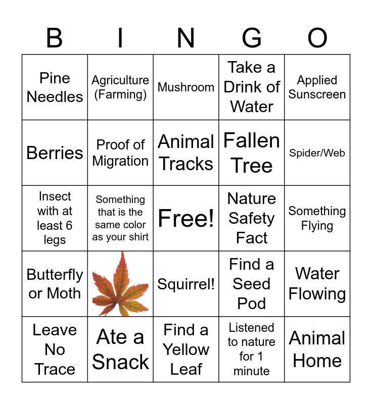 This bingo card has 1 images, a free space and 24 words: Find a Yellow Leaf, Animal Tracks, Leave No Trace, Applied Sunscreen, Pine Needles, Berries, Agriculture (Farming), Nature Safety Fact, Squirrel!, Fallen Tree, Insect with at least 6 legs, Find a Seed Pod, Water Flowing, Proof of Migration, Palm Sized Rock, Something Flying, Mushroom, Spider/Web, Something that is the same color as your shirt, Animal Home, Ate a Snack, Butterfly or Moth, Take a Drink of Water and Listened to nature for 1 minute.