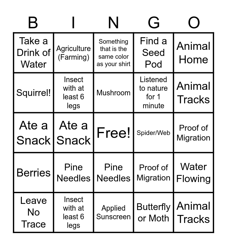 ⚠ This card has duplicate items: Find a Yellow Leaf (2), Animal Tracks (2), Leave No Trace (2), Applied Sunscreen (2), Pine Needles (2), Berries (2), Agriculture (Farming) (2), Nature Safety Fact (2), Squirrel! (2), Fallen Tree (2), Insect with at least 6 legs (2), Find a Seed Pod (2), Water Flowing (2), Proof of Migration (2), Palm Sized Rock (2), Something Flying (2), Mushroom (2), Spider/Web (2), Something that is the same color as your shirt (2), Animal Home (2), Ate a Snack (2), Butterfly or Moth (2), Take a Drink of Water (2), Listened to nature for 1 minute (2)
