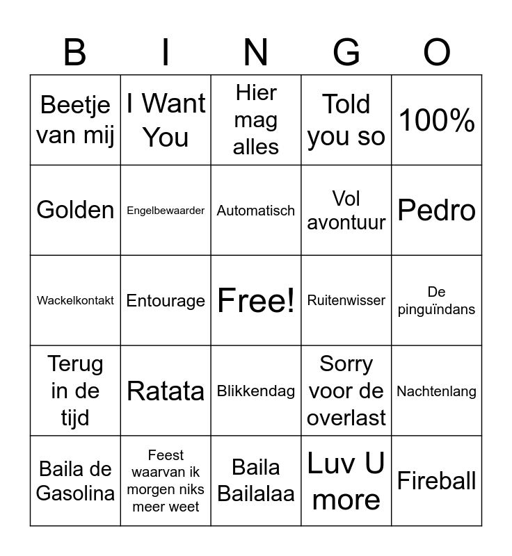 This bingo card has a free space and 33 words: Ga dan!, Echte liefde is te koop, Entourage, Adrenaline, Terug in de tijd, Engelbewaarder, 100%, Baila de Gasolina, I Want You, Flitsmeister, Automatisch, Hier mag alles, Grr.. ik ben een boze dino!, Ferry de roze flamingo, Ruitenwisser, Pedro, Feest waarvan ik morgen niks meer weet, Wackelkontakt, Ratata, Sorry voor de overlast, Blikkendag, Lotje, Beetje van mij, De pinguïndans, Baila Bailalaa, Fireball, Told you so, Vol avontuur, Golden, Nachtenlang, Ik ga zwemmen, Luv U more and Ik ben Kachel.