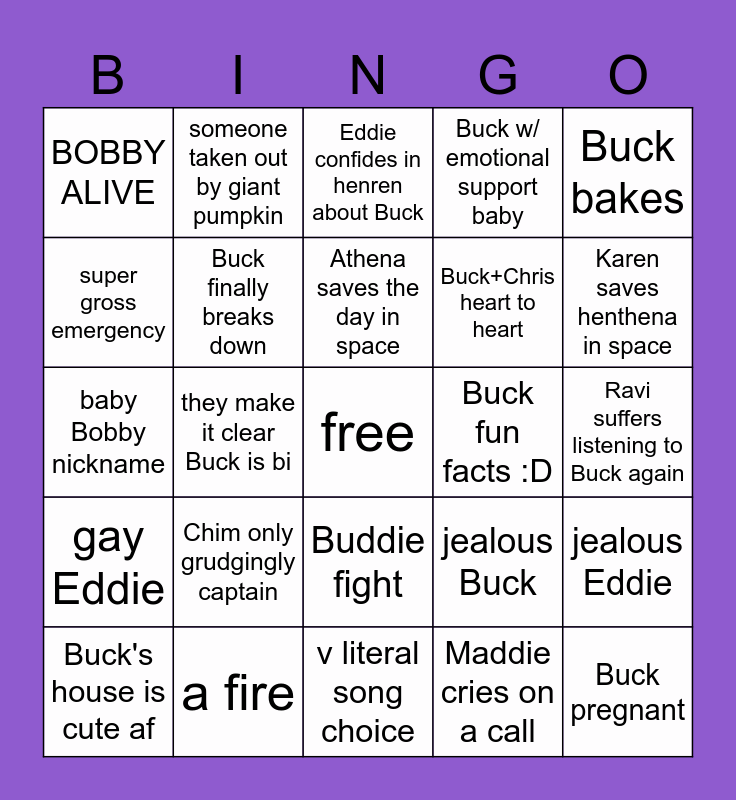This bingo card has a free space and 24 words: Buck's house is cute af, Chim only grudgingly captain, Athena saves the day in space, Maddie cries on a call, Buck bakes, BOBBY ALIVE, someone taken out by giant pumpkin, Eddie confides in henren about Buck, Buck fun facts :D, Ravi suffers listening to Buck again, baby Bobby nickname, Buck finally breaks down, jealous Buck, jealous Eddie, super gross emergency, a fire, v literal song choice, Buck w/ emotional support baby, Karen saves henthena in space, gay Eddie, they make it clear Buck is bi, Buddie fight, Buck+Chris heart to heart and Buck pregnant.