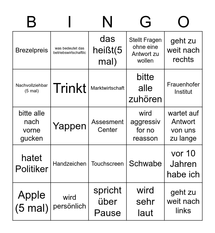 This bingo card has 25 words: Handzeichen, spricht über Pause, Marktwirtschaft, Apple (5 mal), geht zu weit nach rechts, Brezelpreis, Nachvollziehbar (5 mal), was bedeutet das betriebswirtschaftlic, wird aggressiv for no reasson, Touchscreen, bitte alle zuhören, bitte alle nach vorne gucken, Schwabe, vor 10 Jahren habe ich, Trinkt, geht zu weit nach links, wartet auf Antwort von uns zu lange, das heißt(5 mal), Frauenhofer Institut, Yappen, Assesment Center, wird persönlich, hatet Politiker, Stellt Fragen ohne eine Antwort zu wollen and wird sehr laut.