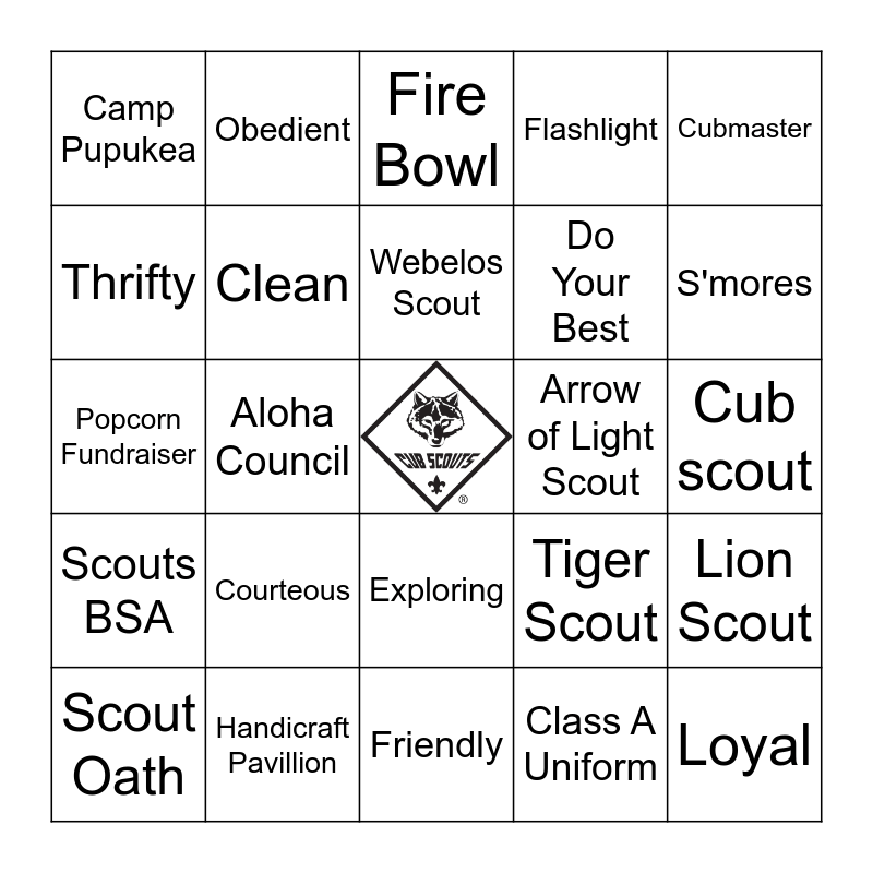 This bingo card has a free space and 52 words: Trustworthy, Loyal, Helpful, Friendly, Courteous, Kind, Obedient, Cheerful, Thrifty, Brave, Clean, Reverent, Lion Scout, Tiger Scout, Wolf Scout, Bear Scout, Webelos Scout, Arrow of Light Scout, Den Leader, Cubmaster, Aloha Council, Class A Uniform, Camp Pupukea, Do Your Best, Whittling Chip, Scout Shop, Camp Fire, Skits and Songs, S'mores, First-Aid Kit, Full Water Bottle, Flashlight, Trail Food, Sun Protection, Whistle, Fire Bowl, Handicraft Pavillion, Aloha Pavillion, Pool Deck, Lodge, Scouting America, Cub scout, Scouts BSA, Venturing, Exploring, Sea Scouts, Camp Card Fundraiser, Popcorn Fundraiser, Eagle Scout, Journey To Excellence, Scout Oath and Scout Law.