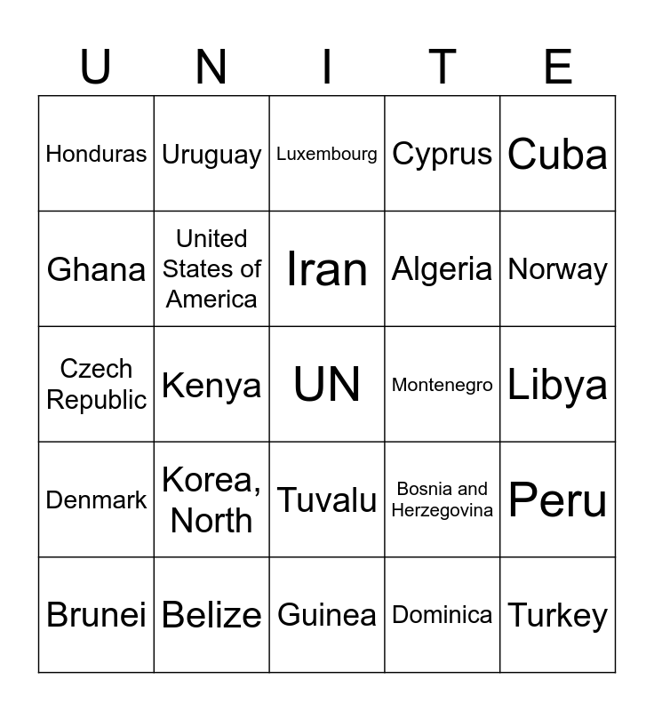 This bingo card has a free space and 200 words: Afghanistan, Albania, Algeria, Andorra, Angola, Antigua and Barbuda, Argentina, Afghanistan, Albania, Algeria, Andorra, Angola, Antigua and Barbuda, Argentina, Armenia, Australia, Austria, Azerbaijan, The Bahamas, Bahrain, Bangladesh, Barbados, Belarus, Belgium, Belize, Benin, Bhutan, Bolivia, Bosnia and Herzegovina, Botswana, Brazil, Brunei, Bulgaria, Burkina Faso, Burundi, Cambodia, Cameroon, Canada, Cape Verde, Central African Republic, Chad, Chile, China, Colombia, Comoros, Republic of the Congo, Democratic Republic of the Congo, Costa Rica, Cote d'Ivoire, Croatia, Cuba, Cyprus, Czech Republic, Denmark, Djibouti, Dominica, Dominican Republic, East Timor, Ecuador, Egypt, El Salvador, Equatorial Guinea, Eritrea, Estonia, Ethiopia, Fiji, Finland, France, Gabon, The Gambia, Georgia, Germany, Ghana, Greece, Grenada, Guatemala, Guinea, Guinea-Bissau, Guyana, Haiti, Honduras, Hungary, Iceland, India, Indonesia, Iran, Iraq, Ireland, Israel, Italy, Jamaica, Japan, Jordan, Kazakhstan, Kenya, Kiribati, Korea, North, Korea, South, Kuwait, Kyrgyzstan, Laos, Latvia, Lebanon, Lesotho, Liberia, Libya, Liechtenstein, Lithuania, Luxembourg, Macedonia, Madagascar, Malawi, Malaysia, Maldives, Mali, Malta, Marshall Islands, Mauritania, Mauritius, Mexico, Micronesia, Federated States of, Moldova, Monaco, Mongolia, Montenegro, Morocco, Mozambique, Myanmar (Burma), Namibia, Nauru, Nepal, Netherlands, New Zealand, Nicaragua, Niger, Nigeria, Norway, Oman, Pakistan, Palau, Panama, Papua New Guinea, Paraguay, Peru, Philippines, Poland, Portugal, Qatar, Romania, Russia, Rwanda, Saint Kitts and Nevis, Saint Lucia, Saint Vincent and the Grenadines, Samoa, San Marino, Sao Tome and Principe, Saudi Arabia, Senegal, Serbia, Seychelles, Sierra Leone, Singapore, Slovakia, Slovenia, Solomon Islands, Somalia, South Africa, South Sudan, Spain, Sri Lanka, Sudan, Suriname, Swaziland, Sweden, Switzerland, Syria, Tajikistan, Tanzania, Thailand, Togo, Tonga, Trinidad and Tobago, Tunisia, Turkey, Turkmenistan, Tuvalu, Uganda, Ukraine, United Arab Emirates, United Kingdom, United States of America, Uruguay, Uzbekistan, Vanuatu, Venezuela, Vietnam, Yemen, Zambia and Zimbabwe.