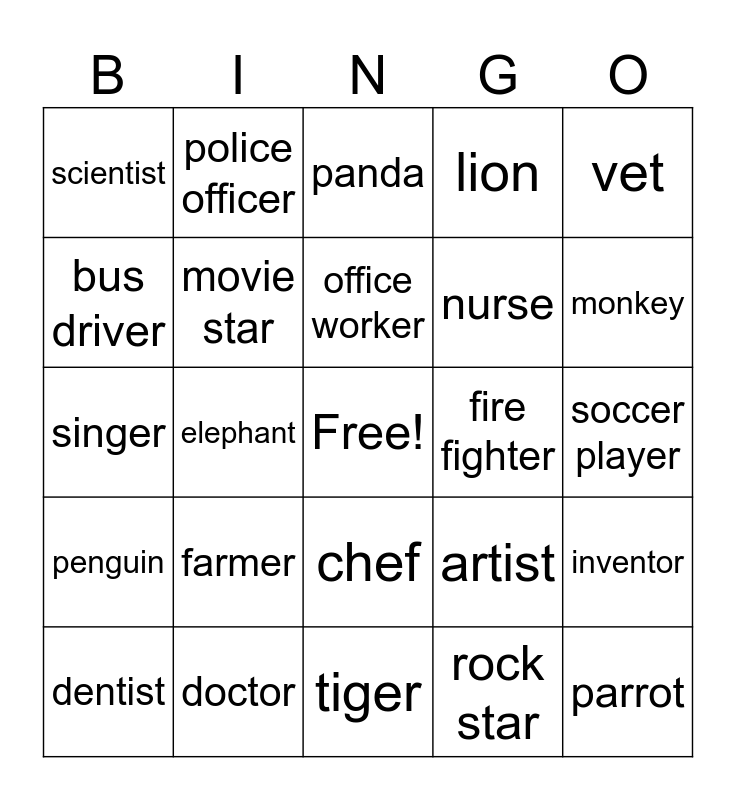 This bingo card has a free space and 24 words: farmer, doctor, office worker, dentist, vet, scientist, bus driver, police officer, fire fighter, chef, nurse, singer, artist, inventor, movie star, rock star, soccer player, panda, monkey, elephant, parrot, penguin, lion and tiger.