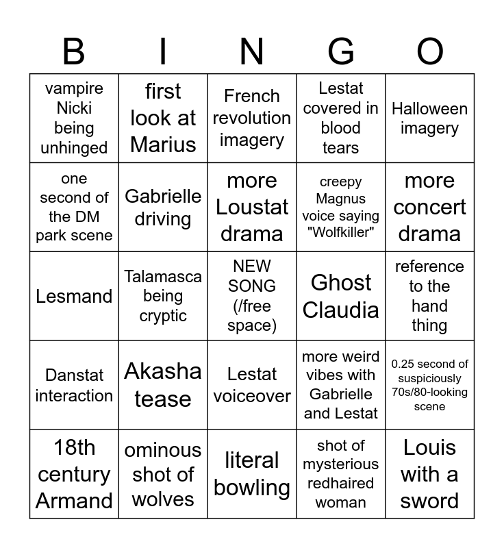This bingo card has a free space and 24 words: Akasha tease, ominous shot of wolves, more Loustat drama, 18th century Armand, Halloween imagery, vampire Nicki being unhinged, one second of the DM park scene, first look at Marius, Ghost Claudia, Lestat voiceover, creepy Magnus voice saying "Wolfkiller", Lesmand, more weird vibes with Gabrielle and Lestat, 0.25 second of suspiciously 70s/80-looking scene, Gabrielle driving, shot of mysterious redhaired woman, reference to the hand thing, French revolution imagery, more concert drama, Talamasca being cryptic, Louis with a sword, Danstat interaction, Lestat covered in blood tears and literal bowling.