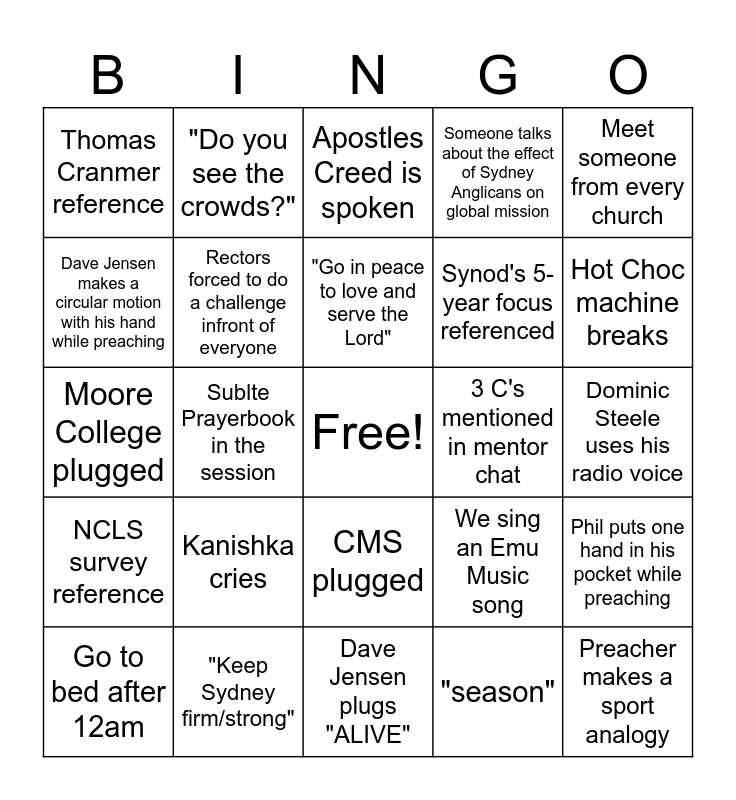 This bingo card has a free space and 34 words: MCs make a dad joke, "season", Preacher mentions family in sermon, Play a youthgroup style ice-breaker, NCLS survey reference, Rectors forced to do a challenge infront of everyone, Meet someone from every church, Go to bed after 12am, "Do you see the crowds?", "Hi Friends", "Go in peace to love and serve the Lord", Apostles Creed is spoken, "Ends of the Earth", Attendance data trends referenced, 3 C's mentioned in mentor chat, Hot Choc machine breaks, "Keep Sydney firm/strong", Moore College plugged, Kanishka cries, We sing an Emu Music song, CMS plugged, MTS in local church plugged, Thomas Cranmer reference, Dominic Steele uses his radio voice, Dave Jensen plugs "ALIVE", Preacher makes a sport analogy, Someone talks about the effect of Sydney Anglicans on global mission, Someone talks about the importance of the local church, Synod's 5-year focus referenced, Dave Jensen makes a circular motion with his hand while preaching, "This is the Word of the Lord", Sublte Prayerbook in the session, Phil puts one hand in his pocket while preaching and “Network”.