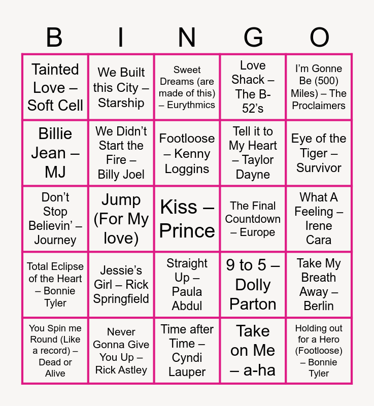 This bingo card has 74 words: Africa – Toto, Faith (remastered) – George Michael, Sweet Dreams (are made of this) – Eurythmics, Maneater – Daryl Hall & John Oates, Karma Chameleon – Culture club, Beat it – MJ, You Make My Dreams (Come True) – Daryl Hall & John Oates, Your Love – The Outfield, You Spin me Round (Like a record) – Dead or Alive, I Wanna Dance with Somebody – Whitney Houston, I’m so Excited – The Pointer Sisters, It’s Still Rock and Roll to Me – Billy Joel, Footloose – Kenny Loggins, Billie Jean – MJ, Push it – Salt-N-Pepa, Jump (For My love), Holding out for a Hero (Footloose) – Bonnie Tyler, Eye of the Tiger – Survivor, All Night Long (All night – Lionel Richie, Don’t Stop Believin’ – Journey, We Didn’t Start the Fire – Billy Joel, We Built this City – Starship, Love Shack – The B-52’s, Hit Me With Your Best Shot – Pat Benatar, Kiss – Prince, Every Breath You Take – the Police, Who Can It Be Now? – Men at Work, (I’ve Had) The Time of My Life – Bill Medley & Jen Warnes, Don’t You (Forget About Me) – Simple Minds, Down Under – Men At Work, I’m Gonne Be (500) Miles) – The Proclaimers, Keep on Loving You – REO Speedwagon, Let’s Dance (2002 Remaster) – David Bowie, Wake Me Up Before You Go-Go – Wham!, Hungry Like the Wolf – Duran Duran, Take on Me – a-ha, Girls Just Want to Have Fund – Cyndi Lauper, You’re My Heart, You’re My Soul – Modern Talking, Material Girl – Madonna, Mr Prerogative – Bobby brown, Time after Time – Cyndi Lauper, Never Gonna Give You Up – Rick Astley, Walk like an Egyptian – The Bangles, What I like About You – The Romantics, Whip It – Devo, Tainted Love – Soft Cell, Cheri Cheri lady – modern Talking, Jessie’s Girl – Rick Springfield, Don’t You Want Me – The Human League, Nothing’s Gonna Stop Us Now – Starship, Rock the Casbah – The Clash, Should I Stay or Should I Go – The Clash, What A Feeling – Irene Cara, Just Like Heaven – The Cure, 99 Red Balloons – Nena, Thriller – MJ, Straight Up – Paula Abdul, Take Me Home Tonight – Eddie Money, You Got It – Roy Orbison, Take My Breath Away – Berlin, Tell it to My Heart – Taylor Dayne, The Power of Love – Huey Lewis & The News, Total Eclipse of the Heart – Bonnie Tyler, Easy Lover – Phil Collins, The Final Countdown – Europe, Ghostbusters – Ray Parker, Jr., Come on Eileen – Dexys Midnight Runners, She Drives me Crazy – Fine Young Cannibals, 9 to 5 – Dolly Parton, Dancing In the Dark – Bruce Springsteen, I Want to Know What love is – Foreigner, Sunglasses At Night – Corey Hart, Danger Zone (Top Gun) – Kenny Loggins and Like a Virgin – Madonna.