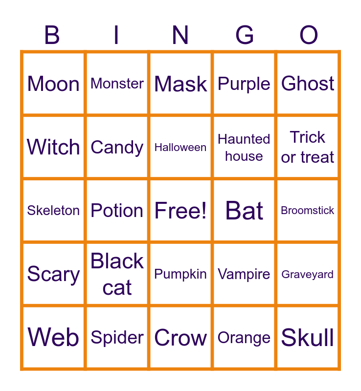 This bingo card has a free space and 24 words: Black cat, Spider, Halloween, Web, Ghost, Moon, Witch, Monster, Bat, Pumpkin, Haunted house, Skeleton, Vampire, Graveyard, Candy, Orange, Broomstick, Mask, Trick or treat, Potion, Skull, Scary, Purple and Crow.