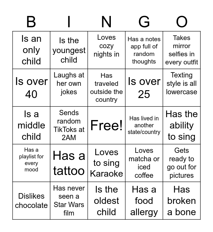 This bingo card has a free space and 36 words: Can play an instrument, Always on Pinterest, Has a birthday this month!, Laughs at her own jokes, Loves matcha or iced coffee, Has a playlist for every mood, Has traveled outside the country, Skipped school, Takes mirror selfies in every outfit, Has a perfume obsession, Sends random TikToks at 2AM, Has a notes app full of random thoughts, Wears claw clips constantly, Has lived in another state/country, Texting style is all lowercase, Is an only child, Has more than 2 siblings, Has a tattoo, Has broken a bone, Loves cozy nights in, Has the ability to sing, Gets ready to go out for pictures, Has never seen a Star Wars film, Dislikes chocolate, Is the oldest child, Is the youngest child, Is a middle child, Is a lefty, Is over 25, Is over 40, Has a pet, Has half siblings, Has a food allergy, Loves to sing Karaoke, Professional singer/song writer and Majored in English & Minored in Classics.