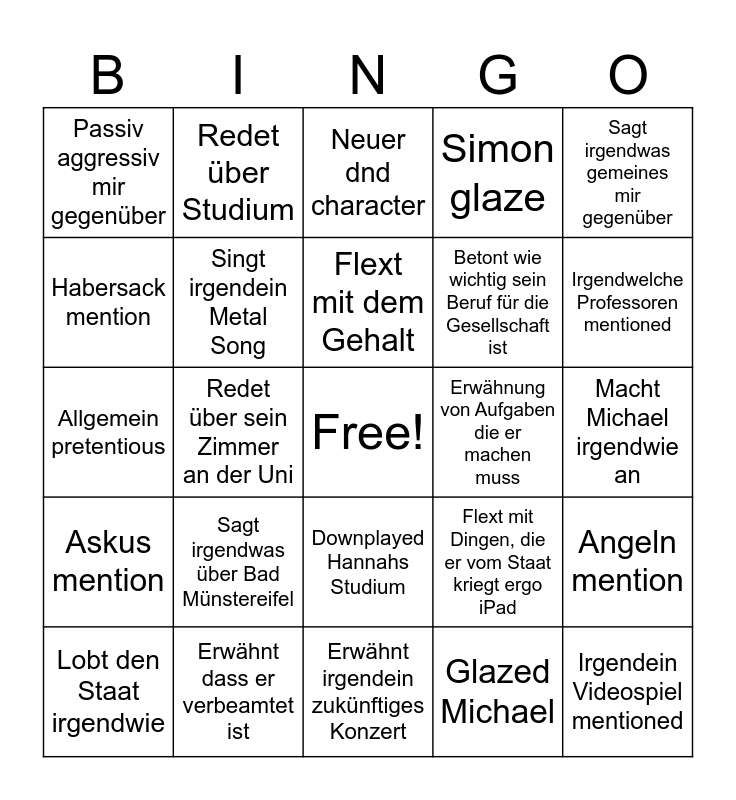 This bingo card has a free space and 24 words: Sagt irgendwas über Bad Münstereifel, Erwähnt dass er verbeamtet ist, Flext mit dem Gehalt, Lobt den Staat irgendwie, Sagt irgendwas gemeines mir gegenüber, Passiv aggressiv mir gegenüber, Habersack mention, Redet über Studium, Erwähnung von Aufgaben die er machen muss, Downplayed Hannahs Studium, Betont wie wichtig sein Beruf für die Gesellschaft ist, Allgemein pretentious, Flext mit Dingen, die er vom Staat kriegt ergo iPad, Angeln mention, Singt irgendein Metal Song, Glazed Michael, Macht Michael irgendwie an, Neuer dnd character, Irgendwelche Professoren mentioned, Redet über sein Zimmer an der Uni, Irgendein Videospiel mentioned, Askus mention, Simon glaze and Erwähnt irgendein zukünftiges Konzert.