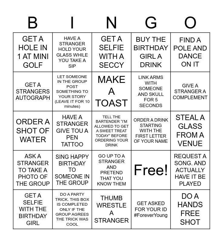 This bingo card has 27 words: Free!, DO A HANDS FREE SHOT, LINK ARMS WITH SOMEONE AND SKULL FOR 5 SECONDS, THUMB WRESTLE A STRANGER, GET A STRANGERS AUTOGRAPH, GET A SELFIE WITH A SECCY, HAVE A STRANGER HOLD YOUR GLASS WHILE YOU TAKE A SIP, ASK A STRANGER TO TAKE A PHOTO OF THE GROUP, ORDER A DRINK STARTING WIITH THE FIRST LETTER OF YOUR NAME, REQUEST A SONG. AND ACTUALLY HAVE IT BE PLAYED, ORDER A SHOT OF WATER, BUY THE BIRTHDAY GIRL A DRINK, GET A SELFIE WITH THE BIRTHDAY GIRL, DO A PARTY TRICK. THIS BOX IS COMPLETED ONLY IF THE GROUP AGREES THE TRICK WAS COOL, GIVE A STRANGER A COMPLEMENT, PLAY “scissors, paper, rock” WITH A STRANGER, LET SOMEONE IN THE GROUP POST SOMETHING TO YOUR STORY (LEAVE IT FOR 10 minutes), MAKE A TOAST, SING HAPPY BIRTHDAY TO SOMEONE IN THE GROUP, GET A HOLE IN 1 AT MINI GOLF, STEAL A GLASS FROM A VENUE, GET ASKED FOR YOUR ID #ForeverYoung, HAVE A STRANGER GIVE TOU A PEN TATTOO, TELL THE BARTENDER “I’M ALLOWED TO GET A SWEET TREAT TODAY” BEFORE ORDERING YOUR DRINK, GO UP TO A STRANGER AND PRETEND THAT YOU KNOW THEM, FIND A POLE AND DANCE ON IT and SKULL YOUR DRINK FOR 10 SECONDS.