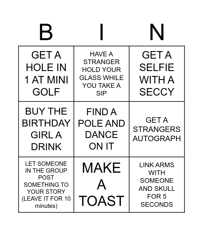 This bingo card has 27 words: Free!, DO A HANDS FREE SHOT, LINK ARMS WITH SOMEONE AND SKULL FOR 5 SECONDS, THUMB WRESTLE A STRANGER, GET A STRANGERS AUTOGRAPH, GET A SELFIE WITH A SECCY, HAVE A STRANGER HOLD YOUR GLASS WHILE YOU TAKE A SIP, ASK A STRANGER TO TAKE A PHOTO OF THE GROUP, ORDER A DRINK STARTING WIITH THE FIRST LETTER OF YOUR NAME, REQUEST A SONG. AND ACTUALLY HAVE IT BE PLAYED, ORDER A SHOT OF WATER, BUY THE BIRTHDAY GIRL A DRINK, GET A SELFIE WITH THE BIRTHDAY GIRL, DO A PARTY TRICK. THIS BOX IS COMPLETED ONLY IF THE GROUP AGREES THE TRICK WAS COOL, GIVE A STRANGER A COMPLEMENT, PLAY “scissors, paper, rock” WITH A STRANGER, LET SOMEONE IN THE GROUP POST SOMETHING TO YOUR STORY (LEAVE IT FOR 10 minutes), MAKE A TOAST, SING HAPPY BIRTHDAY TO SOMEONE IN THE GROUP, GET A HOLE IN 1 AT MINI GOLF, STEAL A GLASS FROM A VENUE, GET ASKED FOR YOUR ID #ForeverYoung, HAVE A STRANGER GIVE TOU A PEN TATTOO, TELL THE BARTENDER “I’M ALLOWED TO GET A SWEET TREAT TODAY” BEFORE ORDERING YOUR DRINK, GO UP TO A STRANGER AND PRETEND THAT YOU KNOW THEM, FIND A POLE AND DANCE ON IT and SKULL YOUR DRINK FOR 10 SECONDS.