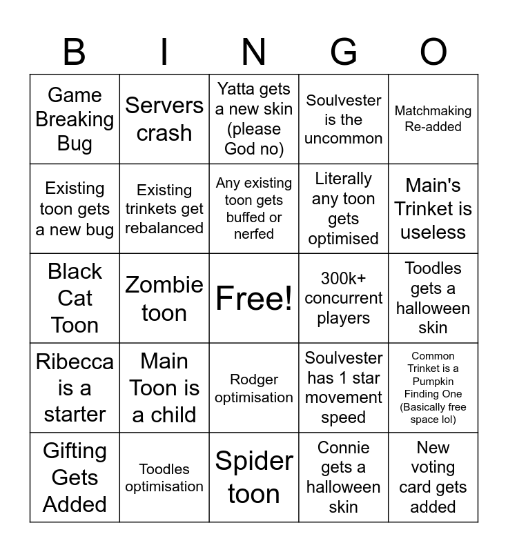 This bingo card has a free space and 24 words: Main Toon is a child, Toodles optimisation, Any existing toon gets buffed or nerfed, Gifting Gets Added, Matchmaking Re-added, Game Breaking Bug, Existing toon gets a new bug, Servers crash, 300k+ concurrent players, Rodger optimisation, Literally any toon gets optimised, Black Cat Toon, Soulvester has 1 star movement speed, Common Trinket is a Pumpkin Finding One (Basically free space lol), Existing trinkets get rebalanced, Connie gets a halloween skin, Toodles gets a halloween skin, Yatta gets a new skin (please God no), Main's Trinket is useless, Zombie toon, New voting card gets added, Ribecca is a starter, Soulvester is the uncommon and Spider toon.