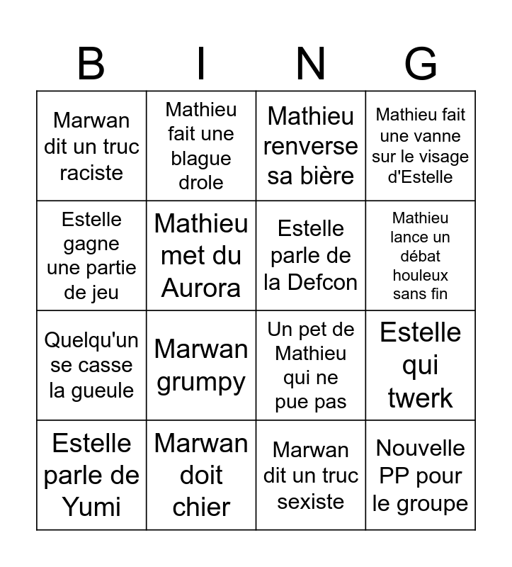 This bingo card has 16 words: Marwan doit chier, Estelle qui twerk, Mathieu renverse sa bière, Marwan dit un truc raciste, Quelqu'un se casse la gueule, Mathieu fait une blague drole, Un pet de Mathieu qui ne pue pas, Marwan dit un truc sexiste, Estelle gagne une partie de jeu, Mathieu met du Aurora, Estelle parle de Yumi, Mathieu fait une vanne sur le visage d'Estelle, Marwan grumpy, Mathieu lance un débat houleux sans fin, Estelle parle de la Defcon and Nouvelle PP pour le groupe.