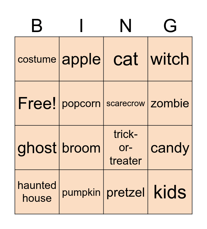 This bingo card has 16 words: pumpkin, candy, cat, costume, ghost, apple, trick-or-treater, pretzel, Free!, popcorn, haunted house, witch, broom, zombie, scarecrow and kids.