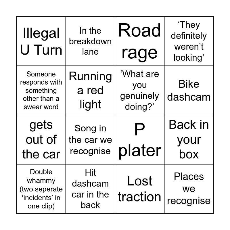 This bingo card has 23 words: Places we recognise, Parked car dashcam, Bike dashcam, Truck dashcam, Someone responds with something other than a swear word, Illegal U Turn, Running a red light, In the breakdown lane, Double whammy (two seperate ‘incidents’ in one clip), Reaction from driver that makes you laugh, Song in the car we recognise, gets out of the car, Driving on the wrong side of the road, Multiple people heard in the dashcam’s car, Hit dashcam car in the back, Inappropriate conduct on a roundabout, Road rage, P plater, ‘What are you genuinely doing?’, Back in your box, ‘They definitely weren’t looking’, Lost traction and When the egos collide.