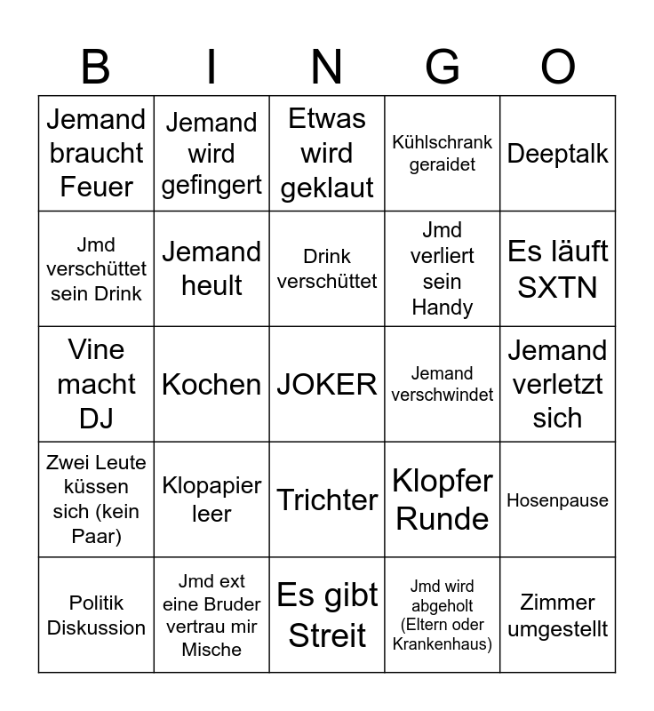 This bingo card has a free space and 39 words: jemand kotzt, Flasche/ Glas geht kaputt, Polizei/ Feuerwehr/ Rettungs- dienst, Jemand heult, Politik Diskussion, Trichter, Drink verschüttet, Aylin raucht ein Kippchen, Deeptalk, Zwei Leute küssen sich (kein Paar), Kochen, Kühlschrank geraidet, Zimmer umgestellt, Jemand verletzt sich, Jemand verschwindet, Klopapier leer, Nachbarn kommen, Jemand braucht Feuer, Fremde sind plötzlich da, Klopfer Runde, Jmd verschüttet sein Drink, Es gibt Streit, Jmd verliert sein Handy, Es läuft SXTN, "Ich schwöre ich bin nicht betrunken", Jemand pisst in Garten, Jemand macht push-ups, Jemand pennt ein, Jemand ist komplett besoffen, Jemand wird gefingert, Jemand redet über Gott, Jmd redet mit ein Huhn, Etwas wird geklaut, Jmd ext eine Bruder vertrau mir Mische, Jmd wird abgeholt (Eltern oder Krankenhaus), Jmd schlägt sich, Hosenpause, Vine macht DJ and Es läuft reezy.