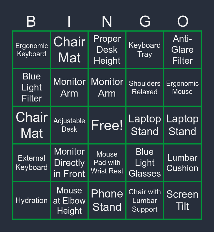 This bingo card has a free space and 95 words: Monitor at Eye Level, 90-Degree Elbows, Chair with Lumbar Support, Feet Flat on Floor, Adjustable Chair Height, Document Holder, Keyboard Close to Body, Mouse at Elbow Height, Anti-Glare Screen, 20-20-20 Rule, Sit-Stand Desk, Wrist Neutral Position, Lighting Behind Monitor, Monitor Arm, Take Microbreaks, Ergonomic Keyboard, Ergonomic Mouse, Headset, Screen Arm’s Length Away, Adjustable Armrests, Neutral Spine, Proper Desk Height, Stretching, Dual Monitor Alignment, Keyboard Tray, Blue Light Filter, Screen Tilt, Shoulders Relaxed, Frequent Position Changes, Cable Management, Monitor Directly in Front, Neutral Neck Position, Task Lighting, Break Reminders, Hydration, Ergonomic Chair, Phone Stand, Document Scanner, Chair Mat, Footrest, Lumbar Cushion, Adjustable Desk, Mouse Pad with Wrist Rest, Anti-Glare Filter, Blue Light Glasses, Laptop Stand, External Keyboard, External Mouse, Monitor Riser, Monitor at Eye Level, 90-Degree Elbows, Chair with Lumbar Support, Feet Flat on Floor, Adjustable Chair Height, Document Holder, Keyboard Close to Body, Mouse at Elbow Height, Anti-Glare Screen, Sit-Stand Desk, Wrist Neutral Position, Monitor Arm, Take Microbreaks, Ergonomic Keyboard, Ergonomic Mouse, Headset, Screen Arm’s Length Away, Adjustable Armrests, Neutral Spine, Proper Desk Height, Stretching, Dual Monitor Alignment, Keyboard Tray, Screen Tilt, Shoulders Relaxed, Frequent Position Changes, Monitor Directly in Front, Neutral Neck Position, Ergonomic Chair, Phone Stand, Chair Mat, Footrest, Lumbar Cushion, Adjustable Desk, Mouse Pad with Wrist Rest, Laptop Stand, External Keyboard, External Mouse, Monitor Riser, Warm Compress Breaks, Cold Pack Relief, Voice-to-Text Software, Easy-Open Tools, Gentle Hand Exercises, Cushion Grip Pens and Padded Gloves.