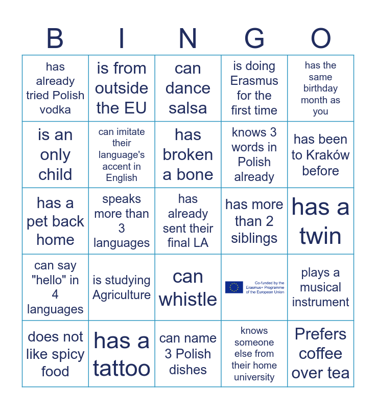 This bingo card has 1 images and 24 words: is studying Agriculture, can name 3 Polish dishes, has broken a bone, does not like spicy food, has the same birthday month as you, has already tried Polish vodka, is an only child, is from outside the EU, has more than 2 siblings, can whistle, knows 3 words in Polish already, has a pet back home, plays a musical instrument, can imitate their language's accent in English, Prefers coffee over tea, has a twin, can dance salsa, has been to Kraków before, speaks more than 3 languages, has already sent their final LA, has a tattoo, can say "hello" in 4 languages, is doing Erasmus for the first time and knows someone else from their home university.