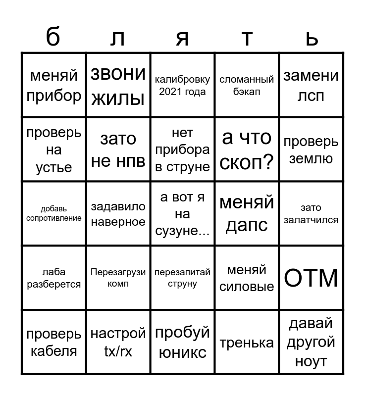 This bingo card has a free space and 24 words: Перезагрузи комп, настрой tx/rx, нет прибора в струне, проверь кабеля, замени лсп, меняй прибор, проверь на устье, звони жилы, меняй дапс, перезапитай струну, а что скоп?, добавь сопротивление, меняй силовые, ОТМ, зато не нпв, тренька, зато залатчился, калибровку 2021 года, проверь землю, задавило наверное, давай другой ноут, лаба разберется, сломанный бэкап and пробуй юникс.