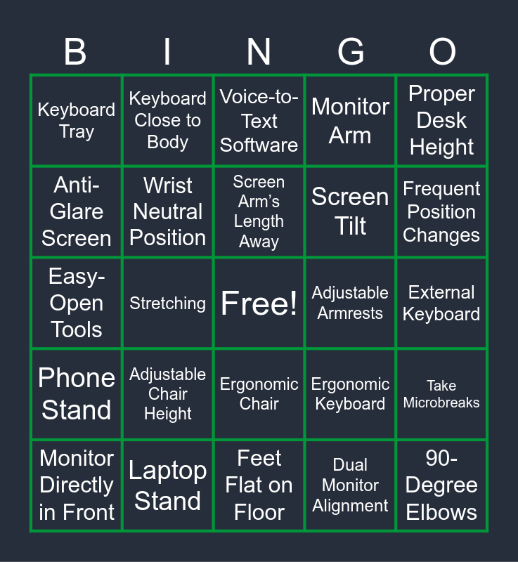 This bingo card has a free space and 46 words: Monitor at Eye Level, 90-Degree Elbows, Chair with Lumbar Support, Feet Flat on Floor, Adjustable Chair Height, Document Holder, Keyboard Close to Body, Mouse at Elbow Height, Anti-Glare Screen, Sit-Stand Desk, Wrist Neutral Position, Monitor Arm, Take Microbreaks, Ergonomic Keyboard, Ergonomic Mouse, Headset, Screen Arm’s Length Away, Adjustable Armrests, Neutral Spine, Proper Desk Height, Stretching, Dual Monitor Alignment, Keyboard Tray, Screen Tilt, Shoulders Relaxed, Frequent Position Changes, Monitor Directly in Front, Neutral Neck Position, Ergonomic Chair, Phone Stand, Chair Mat, Footrest, Lumbar Cushion, Adjustable Desk, Mouse Pad with Wrist Rest, Laptop Stand, External Keyboard, External Mouse, Monitor Riser, Warm Compress Breaks, Cold Pack Relief, Voice-to-Text Software, Easy-Open Tools, Gentle Hand Exercises, Cushion Grip Pens and Padded Gloves.