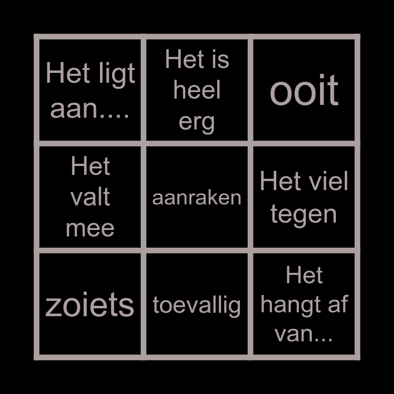 This bingo card has a free space and 8 words: Het viel tegen, ooit, Het is heel erg, zoiets, Het ligt aan...., Het hangt af van..., Het valt mee and toevallig.