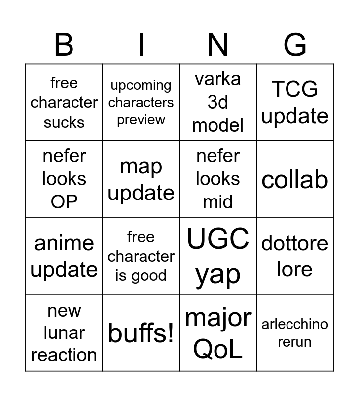 This bingo card has 16 words: buffs!, dottore lore, varka 3d model, free character sucks, anime update, upcoming characters preview, UGC yap, major QoL, nefer looks OP, map update, new lunar reaction, TCG update, free character is good, collab, nefer looks mid and arlecchino rerun.