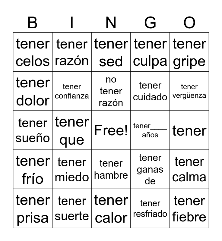 This bingo card has a free space and 24 words: tener miedo, tener suerte, no tener razón, tener prisa, tener gripe, tener celos, tener dolor, tener razón, tener____ años, tener hambre, tener cuidado, tener sueño, tener ganas de, tener calma, tener confianza, tener resfriado, tener, tener sed, tener vergüenza, tener que, tener fiebre, tener frío, tener culpa and tener calor.