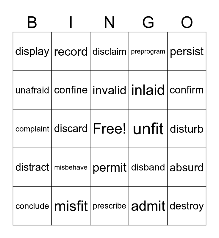 This bingo card has a free space and 32 words: admit, betray, discard, contrast, distract, confine, persist, absurd, record, distinct, invalid, disclaim, preplan, mislaid, unfit, abstract, conclude, complaint, permit, misbehave, disband, provide, disturb, misfit, destroy, preprogram, inlaid, unafraid, display, prescribe, misinform and confirm.