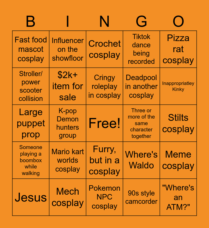 This bingo card has a free space and 29 words: Jesus, Hatsune Miku, K-pop Demon hunters group, Screaming baby, Fast food mascot cosplay, Crochet cosplay, $2k+ item for sale, Mario kart worlds cosplay, Three or more of the same character together, Mech cosplay, Stilts cosplay, "Where's an ATM?", Pokemon NPC cosplay, 90s style camcorder, Inappropriatley Kinky, Someone fully lying down, Furry, but in a cosplay, Someone playing a boombox while walking, Pizza rat cosplay, Large puppet prop, Where's Waldo, That's not a service dog, Deadpool in another cosplay, Stroller/ power scooter collision, Tiktok dance being recorded, Influencer on the showfloor, Meme cosplay, Cringy roleplay in cosplay and Old fan of something taking to young fan.