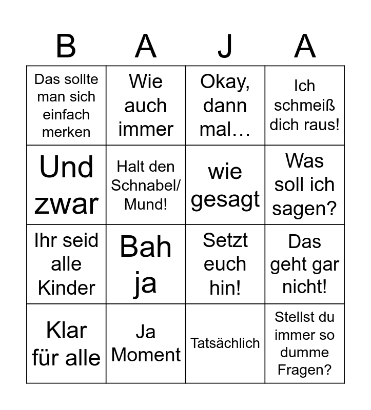 This bingo card has 17 words: Tatsächlich, Klar für alle, Okay, dann mal…, Das sollte man sich einfach merken, Bah ja, Ich schmeiß dich raus!, Das geht gar nicht!, wie gesagt, Was soll ich sagen?, Halt den Schnabel/ Mund!, Ja Moment, Setzt euch hin!, Und zwar, Wie auch immer, Ihr seid alle Kinder, ihr gehört in den Kindergarten and Stellst du immer so dumme Fragen?.