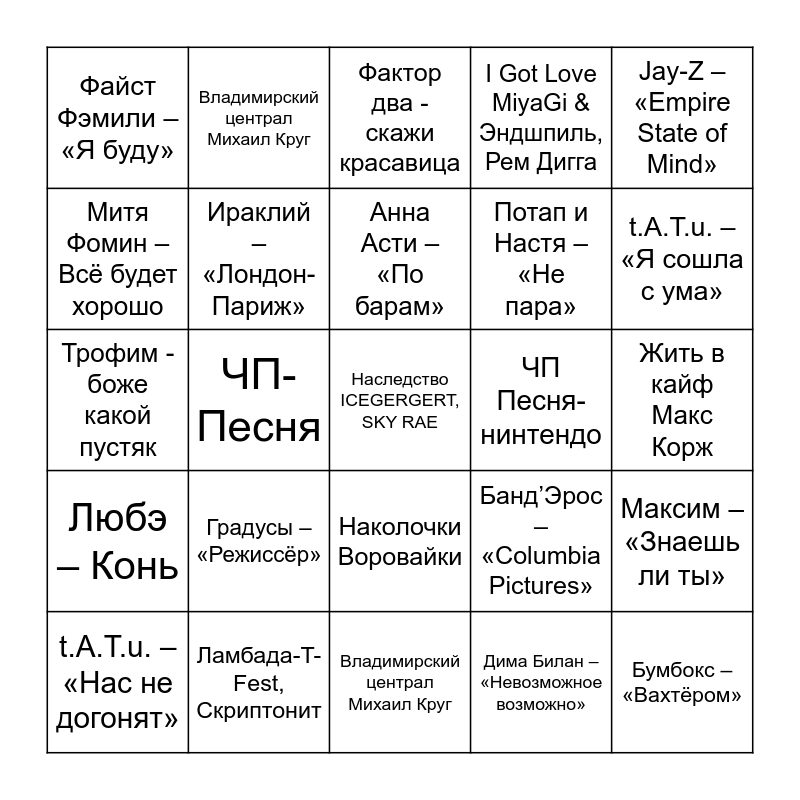 This bingo card has a free space and 47 words: Марджанджа Михаил Шуфутинский, Бумбокс – «Вахтёром», Ice Baby -Гуф, Владимирский централ Михаил Круг, Градусы – «Режиссёр», Лепс- Рюмка водки, Владимирский централ Михаил Круг, Валерий Меладзе – «Салют Веры», Митя Фомин – Всё будет хорошо, 3-е Сентября Михаил Шуфутинский, Ираклий – «Лондон-Париж», I Got Love MiyaGi & Эндшпиль, Рем Дигга, Максим – «Знаешь ли ты», Банд’Эрос – «Columbia Pictures», Tarkan – Dudu, Элджей – «Розовое вино», Анна Асти – «По барам», ЧП Песня-нинтендо, Black Eyed Peas – «Let’s Get It Started», Jay-Z – «Empire State of Mind», ЧП-Песня, Дима Билан – «Невозможное возможно», Файст Фэмили – «Я буду», Потап и Настя – «Не пара», Тимати – «В клубе», t.A.T.u. – «Я сошла с ума», t.A.T.u. – «Нас не догонят», Андрей Губин – «Танцы», Наколочки Воровайки, Любэ – Конь, Приходите в мой дом Михаил Круг., Мумий Тролль- невеста, Intro. Здравствуйте! Alblak 52, Тем, кто с нами Ноггано, Гуф., Дима Билан – Я твой номер один, Ламбада-T-Fest, Скриптонит, Жить в кайф Макс Корж, Цепи Песня, Моя игра Баста, Трофим - боже какой пустяк, Фабрика - про любовь, Фактор два - скажи красавица, Трофим - боже какой пустяк, Звери - районы , кварталы, Еврейский портной Михаил Шуфутинский, Ласковый май - седая ночь and Фраер Михаил Круг..