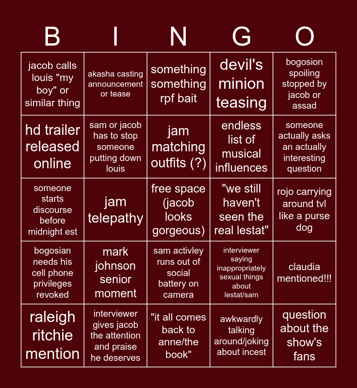 This bingo card has a free space and 24 words: mark johnson senior moment, interviewer gives jacob the attention and praise he deserves, jam matching outfits (?), raleigh ritchie mention, bogosion spoiling stopped by jacob or assad, jacob calls louis "my boy" or similar thing, hd trailer released online, akasha casting announcement or tease, "we still haven't seen the real lestat", sam activley runs out of social battery on camera, endless list of musical influences, someone starts discourse before midnight est, interviewer saying inappropriately sexual things about lestat/sam, claudia mentioned!!!, sam or jacob has to stop someone putting down louis, awkwardly talking around/joking about incest, rojo carrying around tvl like a purse dog, something something rpf bait, someone actually asks an actually interesting question, jam telepathy, question about the show's fans, bogosian needs his cell phone privileges revoked, devil's minion teasing and "it all comes back to anne/the book".