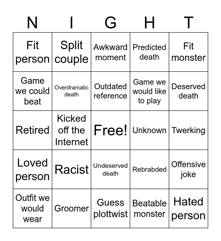 This bingo card has a free space and 24 words: Racist, Groomer, Outdated reference, Outfit we would wear, Fit monster, Fit person, Game we could beat, Split couple, Unknown, Undeserved death, Game we would like to play, Retired, Rebrabded, Offensive joke, Overdramatic death, Beatable monster, Twerking, Awkward moment, Deserved death, Kicked off the Internet, Hated person, Loved person, Predicted death and Guess plottwist.