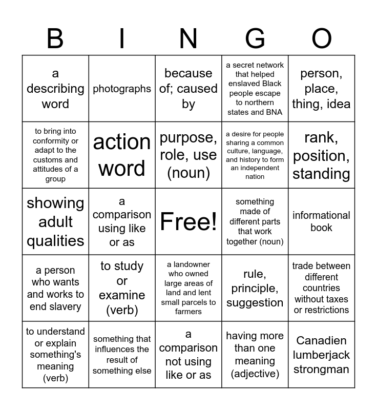This bingo card has a free space and 24 words: to study or examine (verb), something that influences the result of something else, purpose, role, use (noun), to understand or explain something's meaning (verb), person, place, thing, idea, a describing word, to bring into conformity or adapt to the customs and attitudes of a group, photographs, something made of different parts that work together (noun), a landowner who owned large areas of land and lent small parcels to farmers, a desire for people sharing a common culture, language, and history to form an independent nation, showing adult qualities, rule, principle, suggestion, trade between different countries without taxes or restrictions, action word, having more than one meaning (adjective), informational book, because of; caused by, rank, position, standing, a comparison using like or as, Canadien lumberjack strongman, a person who wants and works to end slavery, a secret network that helped enslaved Black people escape to northern states and BNA and a comparison not using like or as.