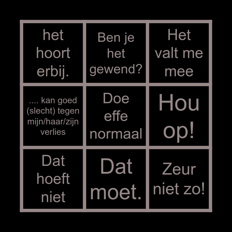 This bingo card has 9 words: Dat hoeft niet, Het valt me mee, Ben je het gewend?, .... kan goed (slecht) tegen mijn/haar/zijn verlies, het hoort erbij., Hou op!, Doe effe normaal, Zeur niet zo! and Dat moet..