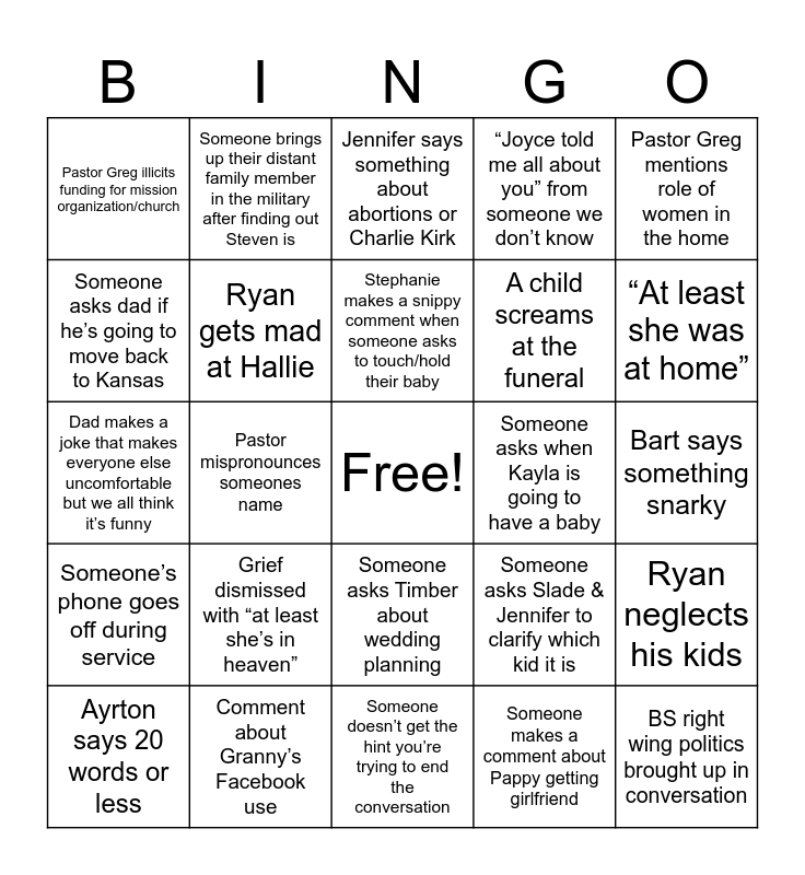This bingo card has a free space and 24 words: Grief dismissed with “at least she’s in heaven”, Comment about Granny’s Facebook use, Stephanie makes a snippy comment when someone asks to touch/hold their baby, Ayrton says 20 words or less, Pastor Greg mentions role of women in the home, Pastor Greg illicits funding for mission organization/church, Someone asks dad if he’s going to move back to Kansas, Someone brings up their distant family member in the military after finding out Steven is, Someone asks when Kayla is going to have a baby, Someone asks Timber about wedding planning, A child screams at the funeral, Dad makes a joke that makes everyone else uncomfortable but we all think it’s funny, Someone asks Slade & Jennifer to clarify which kid it is, Ryan neglects his kids, Ryan gets mad at Hallie, Someone makes a comment about Pappy getting girlfriend, Bart says something snarky, Jennifer says something about abortions or Charlie Kirk, “At least she was at home”, Pastor mispronounces someones name, BS right wing politics brought up in conversation, Someone’s phone goes off during service, “Joyce told me all about you” from someone we don’t know and Someone doesn’t get the hint you’re trying to end the conversation.