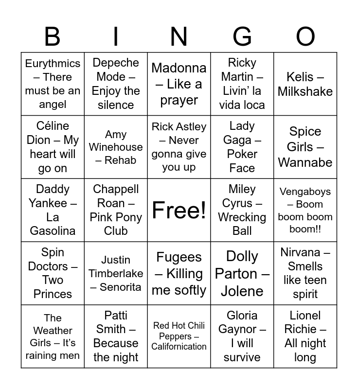 This bingo card has a free space and 75 words: Backstreet Boys – I want it that way, Britney Spears – Baby one more time, Madonna – Like a prayer, Cher – Believe, ABBA – Gimme! Gimme! Gimme! (A man after midnight), Alicia Keys – Fallin’, Aqua – Barbie Girl, Usher & Lil’ Jon & Ludacris – Yeah!, A-ha – Take on me, Blink 182 – All the small things, Blümchen – Herz an Herz, Bonnie Tyler – Total eclipse of the heart, Rick Astley – Never gonna give you up, Céline Dion – My heart will go on, Shania Twain – Man! I feel like a woman, Chappell Roan – Pink Pony Club, Christina Aguilera & Lil’ Kim & Mya & Pink – Lady Marmalade, Lionel Richie – All night long, Jennifer Lopez – Jenny from the block, Kelis – Milkshake, Cyndi Lauper – Girls just wanna have fun, Daddy Yankee – La Gasolina, Amy Winehouse – Rehab, Depeche Mode – Enjoy the silence, Ricky Martin – Livin’ la vida loca, Whitney Houston – I wanna dance with somebody, Michael Jackson – Billie Jean, Beyoncé – Single ladies, Toto – Africa, Destiny’s Child – Survivor, Men at work – Down Under, REM – Losing my religion, No Doubt – Don’t speak, Dolly Parton – Jolene, Spice Girls – Wannabe, Lady Gaga – Poker Face, Bee Gees – Stayin’ Alive, Prince – Kiss, Vengaboys – Boom boom boom boom!!, Gloria Gaynor – I will survive, Wheatus – Teenage Dirtbag, Maroon 5 – This love, TLC – Waterfalls, Gossip – Heavy Cross, MGMT – Kids, Kelly Clarkson - Since U Been Gone, The Weather Girls – It’s raining men, Eurythmics – There must be an angel, Falco – Rock me Amadeus, Men Without Hats – Safety Dance, Eifel 65 – Blue (Da ba dee), Fugees – Killing me softly, Eminem – Without me, Gnarls Barkley – Crazy, Gorillaz – Clint Eastwood, Gotye & Kimbra – Somebody that I used to know, Los Del Rio – Macarena, *NSYNC – It’s gonna be me, Lou Bega – Mambo No. 5, Crazy Town – Butterfly, Justin Timberlake – Senorita, Kate Bush – Running up that hill (A deal with God), Kate Nash – Foundations, Kim Wilde – Kids in America, Shakira – Whenever wherever, Miley Cyrus – Wrecking Ball, Missy Elliott – Work It, Natalie Imbruglia – Torn, Nelly Furtado – I’m like a bird, Nirvana – Smells like teen spirit, Spin Doctors – Two Princes, Patti Smith – Because the night, Queen – Don’t stop me now, Red Hot Chili Peppers – Californication and Rihanna – Diamonds.