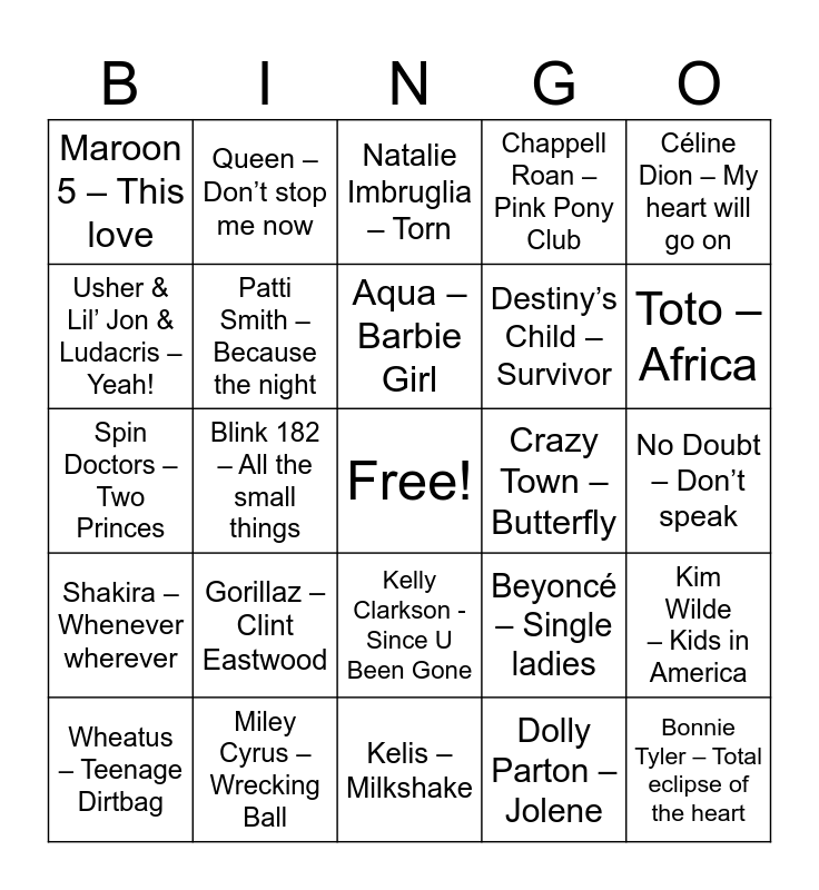 This bingo card has a free space and 75 words: Backstreet Boys – I want it that way, Missy Elliott – Work It, Natalie Imbruglia – Torn, Nelly Furtado – I’m like a bird, Nirvana – Smells like teen spirit, Red Hot Chili Peppers – Californication, Rihanna – Diamonds, Britney Spears – Baby one more time, Madonna – Like a prayer, Cher – Believe, ABBA – Gimme! Gimme! Gimme! (A man after midnight), Alicia Keys – Fallin’, Aqua – Barbie Girl, Usher & Lil’ Jon & Ludacris – Yeah!, A-ha – Take on me, Blink 182 – All the small things, Blümchen – Herz an Herz, Bonnie Tyler – Total eclipse of the heart, Rick Astley – Never gonna give you up, Céline Dion – My heart will go on, Shania Twain – Man! I feel like a woman, Spin Doctors – Two Princes, Patti Smith – Because the night, Queen – Don’t stop me now, Chappell Roan – Pink Pony Club, Christina Aguilera & Lil’ Kim & Mya & Pink – Lady Marmalade, Lionel Richie – All night long, Daddy Yankee – La Gasolina, Amy Winehouse – Rehab, Depeche Mode – Enjoy the silence, Ricky Martin – Livin’ la vida loca, Whitney Houston – I wanna dance with somebody, Michael Jackson – Billie Jean, Beyoncé – Single ladies, Toto – Africa, Destiny’s Child – Survivor, Men at work – Down Under, REM – Losing my religion, No Doubt – Don’t speak, Dolly Parton – Jolene, Spice Girls – Wannabe, Lady Gaga – Poker Face, Bee Gees – Stayin’ Alive, Prince – Kiss, Vengaboys – Boom boom boom boom!!, Gloria Gaynor – I will survive, Wheatus – Teenage Dirtbag, Maroon 5 – This love, TLC – Waterfalls, Gossip – Heavy Cross, MGMT – Kids, Kelly Clarkson - Since U Been Gone, The Weather Girls – It’s raining men, Eurythmics – There must be an angel, Falco – Rock me Amadeus, Men Without Hats – Safety Dance, Eifel 65 – Blue (Da ba dee), Fugees – Killing me softly, Eminem – Without me, Gnarls Barkley – Crazy, Gorillaz – Clint Eastwood, Gotye & Kimbra – Somebody that I used to know, Los Del Rio – Macarena, *NSYNC – It’s gonna be me, Lou Bega – Mambo No. 5, Crazy Town – Butterfly, Justin Timberlake – Senorita, Kate Bush – Running up that hill (A deal with God), Kate Nash – Foundations, Kim Wilde – Kids in America, Shakira – Whenever wherever, Miley Cyrus – Wrecking Ball, Jennifer Lopez – Jenny from the block, Kelis – Milkshake and Cyndi Lauper – Girls just wanna have fun.