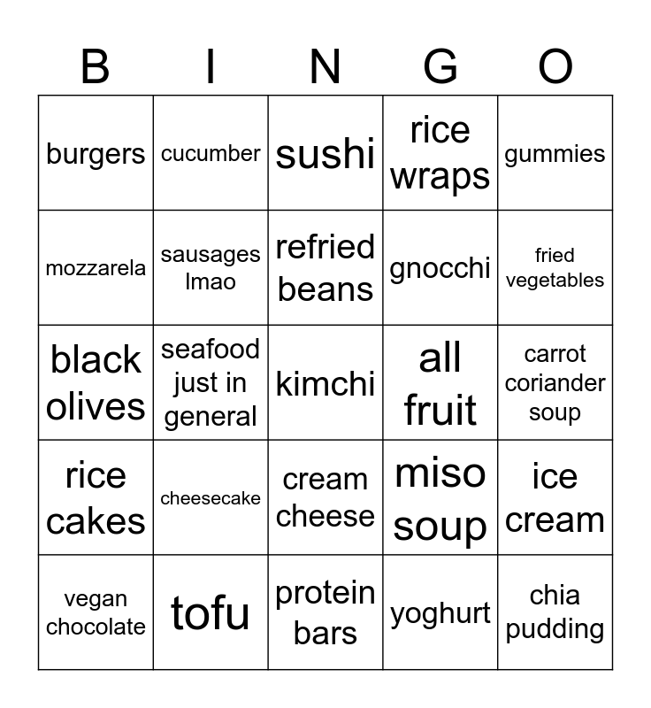 This bingo card has a free space and 24 words: cheesecake, tofu, refried beans, vegan chocolate, gummies, burgers, mozzarela, cucumber, all fruit, cream cheese, gnocchi, black olives, miso soup, ice cream, sausages lmao, yoghurt, carrot coriander soup, sushi, fried vegetables, seafood just in general, chia pudding, rice cakes, rice wraps and protein bars.