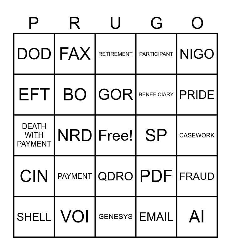 This bingo card has a free space and 38 words: ABC, NOTIFICATIONS, DTP, BO, FRAUD, PAYMENT, GOR, J&S, NIGO, BENEFICIARY, NRD, PARTICIPANT, AI, CASEWORK, EFT, CIN, DOB, RETIREMENT, P360, SP, DOD, VOI, PRIDE, SHELL, FIT, GENESYS, SIT, CALCULATION, 1+1=, VERIZON, IMPERSONATION, QDRO, EMAIL, FAX, MAIL, PDF, DEATH WITH PAYMENT and DOH.