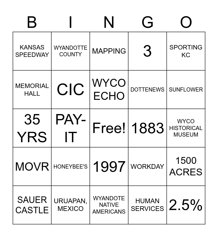 This bingo card has a free space and 24 words: SAUER CASTLE, HONEYBEE'S, WYCO ECHO, HUMAN SERVICES, SPORTING KC, KANSAS SPEEDWAY, WYANDOTTE COUNTY, MAPPING, 1883, WYCO HISTORICAL MUSEUM, 35 YRS, CIC, WORKDAY, 1500 ACRES, MEMORIAL HALL, URUAPAN, MEXICO, WYANDOTE NATIVE AMERICANS, 3, SUNFLOWER, MOVR, PAY-IT, 1997, DOTTENEWS and 2.5%.