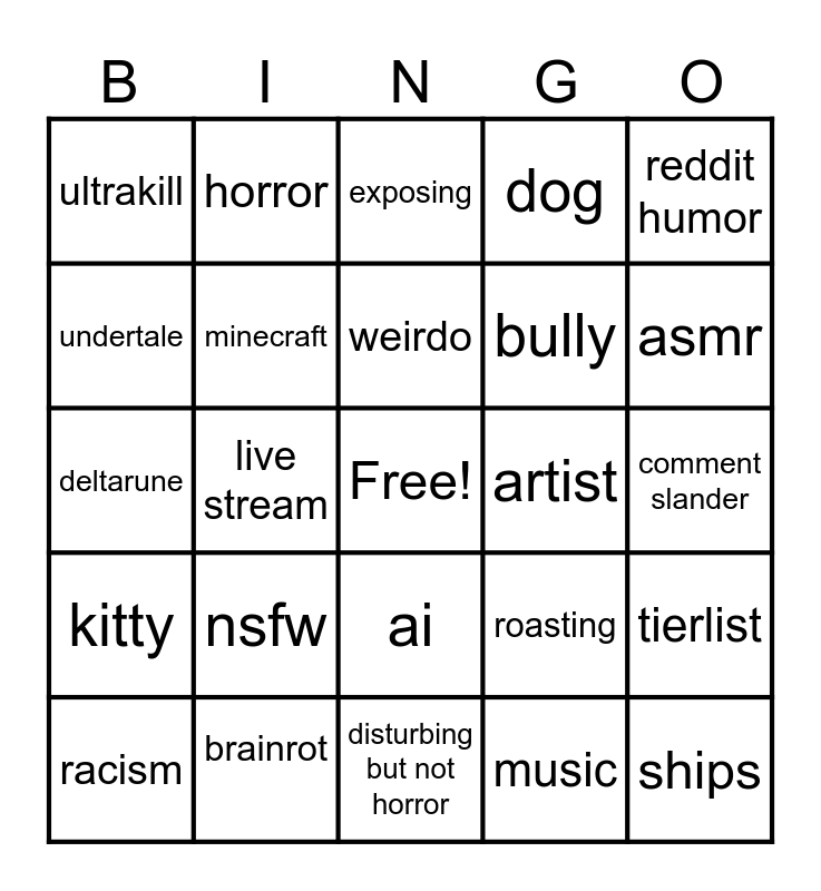 This bingo card has a free space and 24 words: nsfw, brainrot, weirdo, racism, reddit humor, ultrakill, undertale, horror, artist, ai, bully, deltarune, roasting, tierlist, minecraft, music, comment slander, exposing, asmr, live stream, ships, kitty, dog and disturbing but not horror.