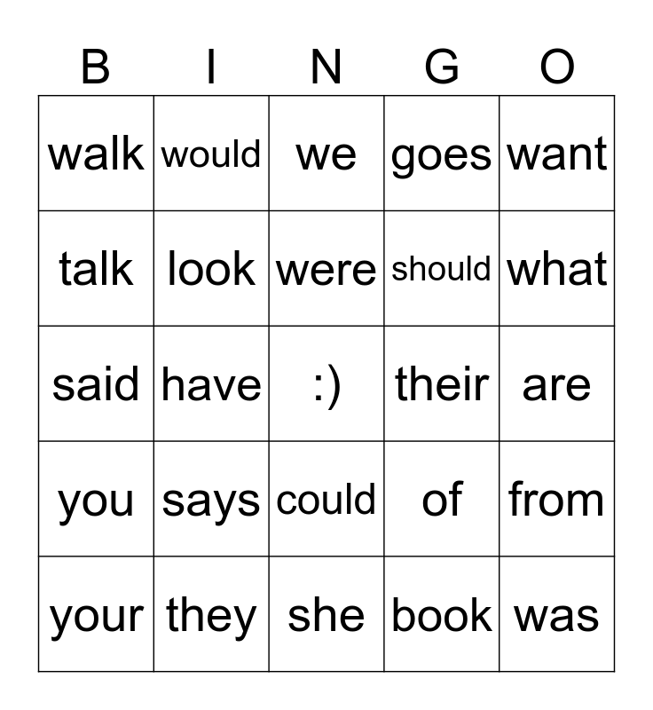 This bingo card has a free space and 24 words: says, they, were, your, want, walk, talk, would, their, could, should, said, of, from, look, book, are, we, what, have, was, you, goes and she.