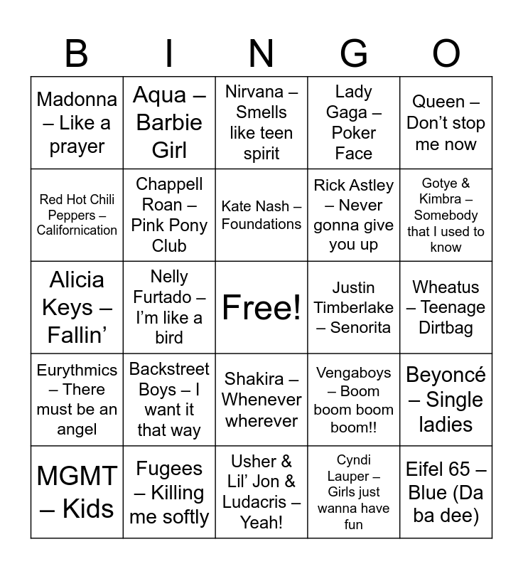 This bingo card has a free space and 75 words: Rihanna – Diamonds, Céline Dion – My heart will go on, Nirvana – Smells like teen spirit, Christina Aguilera & Lil’ Kim & Mya & Pink – Lady Marmalade, Toto – Africa, Men at work – Down Under, Destiny’s Child – Survivor, Daddy Yankee – La Gasolina, A-ha – Take on me, Shania Twain – Man! I feel like a woman, TLC – Waterfalls, Lionel Richie – All night long, Kate Nash – Foundations, Red Hot Chili Peppers – Californication, Natalie Imbruglia – Torn, Nelly Furtado – I’m like a bird, Blink 182 – All the small things, Eifel 65 – Blue (Da ba dee), Blümchen – Herz an Herz, Queen – Don’t stop me now, Crazy Town – Butterfly, Alicia Keys – Fallin’, Chappell Roan – Pink Pony Club, Aqua – Barbie Girl, Lady Gaga – Poker Face, Britney Spears – Baby one more time, Ricky Martin – Livin’ la vida loca, Whitney Houston – I wanna dance with somebody, Michael Jackson – Billie Jean, Prince – Kiss, REM – Losing my religion, Falco – Rock me Amadeus, Bee Gees – Stayin’ Alive, Vengaboys – Boom boom boom boom!!, Gotye & Kimbra – Somebody that I used to know, Rick Astley – Never gonna give you up, Gloria Gaynor – I will survive, Spice Girls – Wannabe, Wheatus – Teenage Dirtbag, Cyndi Lauper – Girls just wanna have fun, The Weather Girls – It’s raining men, Kelly Clarkson - Since U Been Gone, Men Without Hats – Safety Dance, Gossip – Heavy Cross, Miley Cyrus – Wrecking Ball, Eminem – Without me, MGMT – Kids, Madonna – Like a prayer, Cher – Believe, Maroon 5 – This love, Kim Wilde – Kids in America, Shakira – Whenever wherever, Amy Winehouse – Rehab, Gorillaz – Clint Eastwood, No Doubt – Don’t speak, Patti Smith – Because the night, Gnarls Barkley – Crazy, Missy Elliott – Work It, Dolly Parton – Jolene, Depeche Mode – Enjoy the silence, Backstreet Boys – I want it that way, ABBA – Gimme! Gimme! Gimme! (A man after midnight), Los Del Rio – Macarena, *NSYNC – It’s gonna be me, Spin Doctors – Two Princes, Justin Timberlake – Senorita, Kate Bush – Running up that hill (A deal with God), Jennifer Lopez – Jenny from the block, Kelis – Milkshake, Beyoncé – Single ladies, Eurythmics – There must be an angel, Fugees – Killing me softly, Lou Bega – Mambo No. 5, Usher & Lil’ Jon & Ludacris – Yeah! and Bonnie Tyler – Total eclipse of the heart.