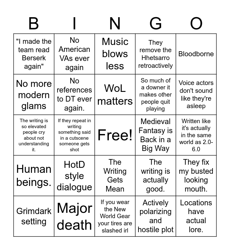 This bingo card has a free space and 24 words: HotD style dialogue, Major death, WoL matters, Grimdark setting, Bloodborne, "I made the team read Berserk again", No more modern glams, No American VAs ever again, Medieval Fantasy is Back in a Big Way, The Writing Gets Mean, So much of a downer it makes other people quit playing, The writing is so elevated people cry about not understanding it., The writing is actually good., They fix my busted looking mouth., No references to DT ever again., Actively polarizing and hostile plot, Written like it's actually in the same world as 2.0-6.0, Music blows less, Voice actors don't sound like they're asleep, If they repeat in writing something said in a cutscene someone gets shot, Locations have actual lore., Human beings., They remove the Hhetsarro retroactively and If you wear the New World Gear your tires are slashed irl.